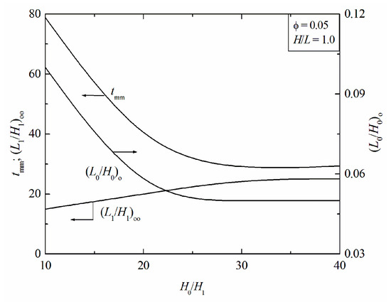 Effect of the ratio H0/H1 for twice-minimized infusion time, tmm, and the respective optimal shapes, (L0/H0)o, (L1/H1)oo.
