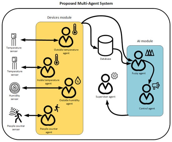 Therefore, in this article, a fuzzy control system based on a multi-agent platform is proposed to control the effectiveness of home and building central heating systems. The main contributions of the paper are listed below: (I) the proposal of a self-designed MAS for IoT and smart-environments, (II) the communication behavior between the MAS’s agents, (III) the collection of sensor data recollected by intelligent agents and (IV) the design of an intelligent control system based on fuzzy logic principles. In the next section, the proposal will be explained in more depth. Table 1 shows a comparison between the proposal and other similar studies. Some of these research studies have been explained before. The study [52] defines a non-linear mathematical model that takes into account information from several sensors inside and outside the home that can produce control of the heating system in small buildings and homes.