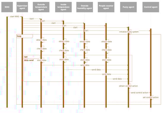 This process will be repeated as many times as desired. The most interesting approach is to run this process every, for example, five minutes to check if the environmental circumstances have changed since the last control action was performed and therefore, the control action has also changed. With this approach, the computational cost, as well as the impact on a real distributed sensor network, will be minimized since sensors will not be constantly sending data. This strategy will also reduce energy consumption since agents can sleep while this window of time is closed, decreasing the consumption of said agents as well as sensors. A lower interval is possible; however, the energy consumption of the system and sensors will increase. A higher interval is also possible, although the measured values may change during that time as it might affect the users’ comfort. Consequently, it is considered that the appropriate interval should be set to five minutes. The whole process is illustrated in Figure 2 for a better understanding.