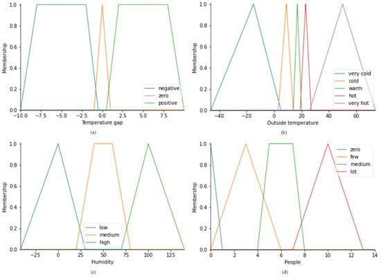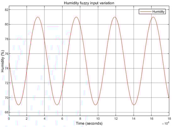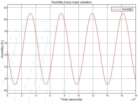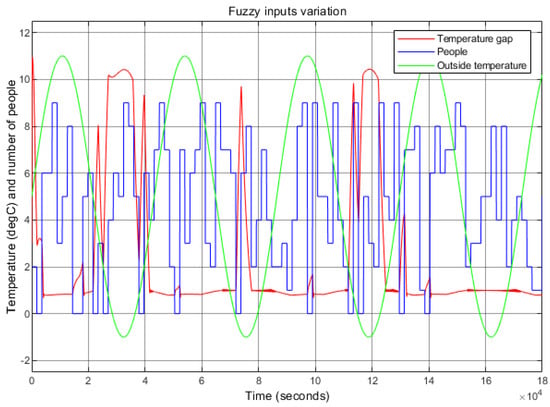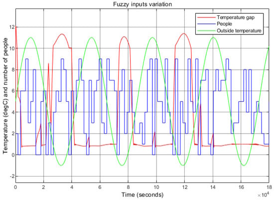 To obtain the temperature values, the amplitude was defined to 6, the frequency to , the phase to 0, and the bias to 5. Another measured value is the humidity, this variable is also simulated with Equation (4). In this case, the amplitude was defined to 6, frequency to , the phase to 0, and the bias to 75; furthermore, the phase is set to π to simulate the logic behavior between outside temperature and outside humidity. The last measured value is the amount of people, in this case, the simulation is provided by random numbers in the interval [0, 10] that changes every 30 min.