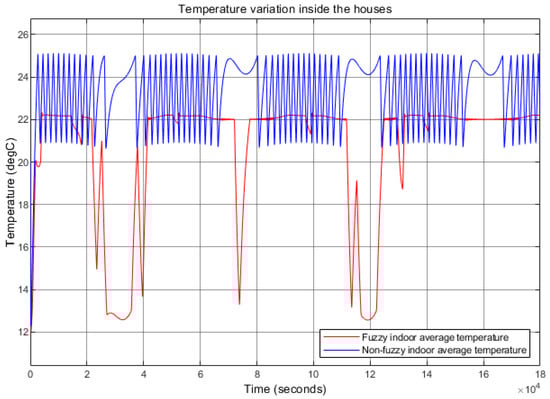In addition, to better illustrate the total cost of both simulations, Table 5 is included. It shows the total cost of each simulation and the average temperature over the simulation. As can be seen, the proposed system decreases the cost by $10.84. The total cost is obtained by multiplying the fuel consumption by a fixed price (0.3002 $/l) defined again by the MATLAB Simulink model. However, the mean temperature is a bit lower because of the behavior explained before where the temperature decreases when there are no people in the building. That temperature is the average temperature during the entire simulation. In the proposal, the average temperature decreases when there are no people in the house, the heating system is turned off. During those moments, the temperature inside declines. Therefore, it is normal that these moments are reflected in the calculation of the average temperature. However, during the rest of the situations in which the heating is on, the temperature remains stable.