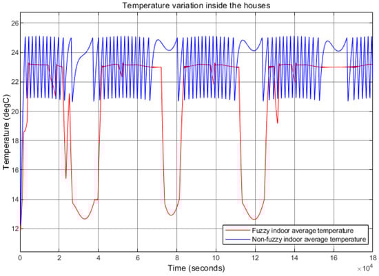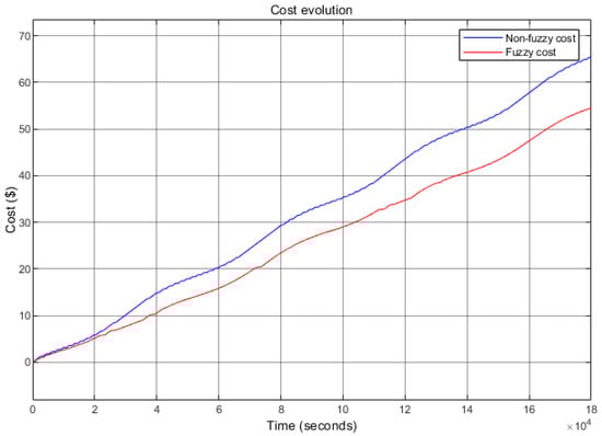 The fuzzy proposal retains a slight error in regards to the target temperature. However, now both systems achieve the same temperature (23 °C). The fuzzy proposal still has temperature losses due to the fuzzy rules defined when there are no individuals in the building. Additionally, Figure 11 shows the effectiveness of the proposed system related to cost and energy used reduction. This output can also be seen in Table 6. Therefore, the proposed system achieves one of its main goals: cost reduction, energy use reduction, and, consequently, the reduction in gas emissions.