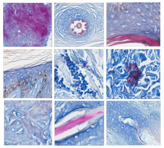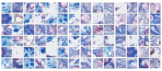 Next, negative image blocks with a faint reddish color and structures with similar appearances to positive bacilli were extracted. These image blocks represented a great clinical challenge to physicians for differentiating from bacilli. A total of 1383 negative image blocks composed of sebaceous glands, infiltration of mast cells, granules from mast cells, and background stain that showed silk-like features with a faint reddish color were collected as the faint group (Figure 3).