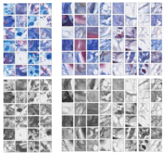 Finally, a grayscale image experiment was proposed to evaluate the overall contribution of color features to the success of the proposed convolutional neural network. In this group, the 1202 negative image blocks were first selected from the previous two groups. Then, both the original color samples and the grayed samples were prepared for model training and testing, as shown in Figure 4. For grayed samples, only morphological structure information and relative intensities compared to surrounding tissues could be used. The result of this experiment would further illustrate the contribution of color information used in stained bacillus detection and make the performance of the diagnostic method more promising for clinical use.