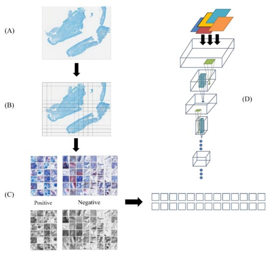 The computer-aided diagnosis workflow. (A) A whole-slide pathology image. (B) Cropped samples fitting to mycobacteria bacilli (20 × 20 pixels) (C) Positive and negative sample selection. (D) Transferred deep convolutional neural network (DCNN) model.