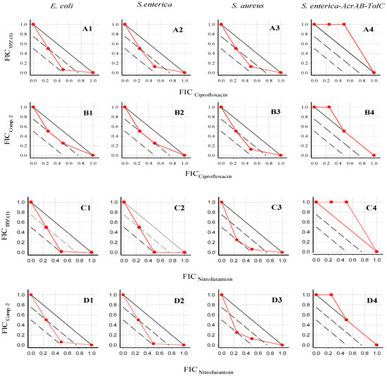 Meanwhile, the same combination assay carried out against the S. enterica strain over-expressing AcrAB-TolC revealed only additive and non-interactive effects (FICI of 1.0–1.5) (Table 3); the additive effects have been observed for the lead compound (2) coupled with the 1/2 MIC concentrations of either Cipro or NFT (FICI ~ 1; Figure 2B4,D4).