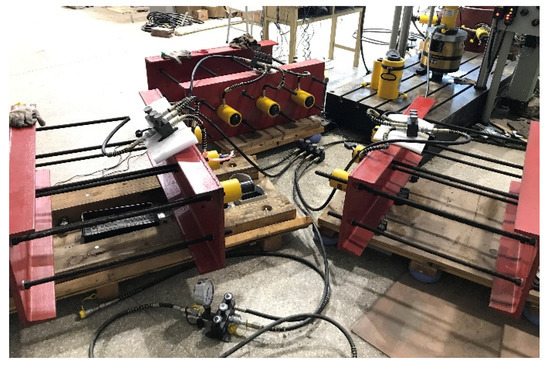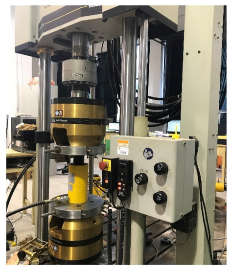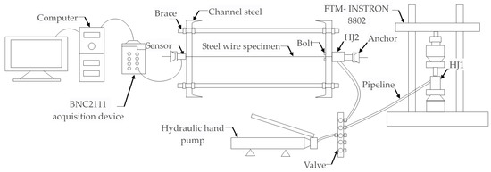 In the traditional fatigue test, the fatigue test machine (FTM) is directly used to apply the fatigue load to one specimen at a time. When the number of test specimens is large, the test will take a lot of time. In addition, due to the size limitation between the two clamps of the FTM and the vertical placement of the specimen, the corrosive medium is not easy to act on the steel wire, so the corrosion fatigue test is difficult to be realized. In view of the above reasons, a new test device is designed in this paper. The schematic diagram of the device is shown in Figure 3, consisting of two main parts. One is composed of the FTM and the hydraulic jack with large range, HJ1 for short, which are responsible for providing the total fatigue loads. HJ1 is placed between two clamps of FTM, and the oil amount of HJ1 is provided by hydraulic hand pump with oil storage capacity of 2700cc. The FTM adopted in this test is INSTRON 8802, which is shown in Figure 4. The other part is the fatigue loading device for wire specimens, as shown in Figure 5, including 40#C channel steel, braces with diameter of 20 mm, bolts, multiple hydraulic jacks with small range, HJ2s for short, anchors. HJ1 drives a series of HJ2s through tubing and diverter valve to apply fatigue loads to multiple steel wires. Data acquisition is carried out through data acquisition equipment—National Instruments BNC-2111, hollow shaft type annular force sensor and computer.