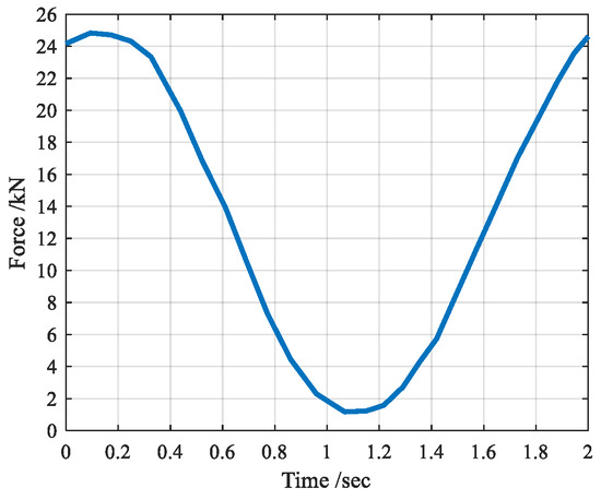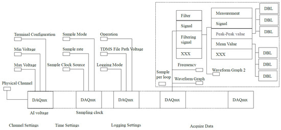 When the hydraulic system is working, the internal particles of the hydraulic oil collide with each other and produce violent friction. Hydraulic oil is also subject to friction resistance when passing through local obstacles. These will cause the loss of oil in the oil circuit and the reduction of oil pressure, ultimately consuming the energy of the whole system. Because of the resistance in the oil circuit, there is an error between the load acting on steel wire and that provided by FTM. A force sensor is used to monitor the actual load acting on steel wire and adjust it to the value set by FTM. Considering that the wire is circular, a hollow shaft type annular force sensor is selected to monitor the fatigue loads, as shown in Figure 6. The working principle of this sensor is to convert the force received by the steel wire into voltage signal. A data acquisition device, named National Instruments BNC-2111, is used to collect the voltage signal output from the sensor as shown in Figure 7. The force sensor is connected to the BNC-2111 by transmission data line. The BNC-2111 is connected to the computer. The computer can record and read the tension in each wire during fatigue loading. The Laborary Virtual Instrument Engineering Workbench (LabVIEW) software is used to calibrate the collected signal, so as to realize the conversion of voltage signal to force signal and perform the monitoring and recording of fatigue load. Figure 8 demonstrates the process and working principle of data collection by LabVIEW software, through which force loads acting on each steel wire can be collected synchronously. LabVIEW uses the graphical editing language G to write the program in block diagram form. Figure 9 shows the fatigue loads recorded by LabVIEW software, that is, the real-time forces applied to multiple steel wires and one of the wires respectively.