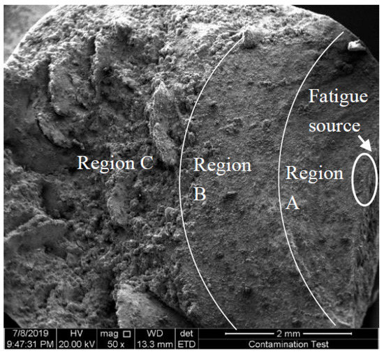 Figure 11 shows the macroscopic morphology of typical corrosion fatigue fracture of high-strength steel wire used in bridge cables. It can be seen that fatigue cracks generally start at a certain surface defect or stress concentration and slowly extend into the steel wire in a semi-circular until the steel wire suddenly breaks. The whole fatigue fracture surface can be roughly divided into three regions: slow extending region (Region A), fast extending region (Region B) and instantaneous fracture region (Region C). From Figure 11, it can be seen that slow extending region is relatively smooth, fatigue cracks extend inward in circular arc. This is mainly because the stress intensity factor (SIF) at the crack tip is relatively small at the initial crack propagation stage. Each time the steel wire undergoes a cyclic load, the crack tip advances a tiny distance, so the law of crack propagation at this stage is relatively stable. Thus, this stage is commonly referred to as the steady-state extension stage. With the continuous application of cyclic load, the stress intensity factor at the crack tip increases as the crack grows into the material, and the crack propagation rate changes from slow to fast, so the cracks enter the fast extending region. At this stage, the crack propagation depth under each cyclic load is greater than that in the steady-state region, which is the transition region between the steady-state region and the instantaneous fracture region. When the cracks grow to a certain depth, the effective cross-sectional area of the steel wire will be reduced to a critical value. At this time, the fracture toughness cannot resist the stress intensity at the crack tip, so the cracks enter the unsteady-state extension stage, and the steel wire breaks instantly. As can be seen from the macroscopic morphology of the steel wire fracture surface, the instantaneous fracture region is relatively rough with obvious radial fibers.