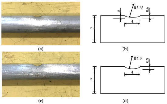 In order to investigate the influence of depth of machine-cut notches on the fatigue crack propagation of steel wire, semi-ellipsoidal notches with different depths are used for the test in this paper. The depths are taken as 0.6 mm, 0.8 mm, 1.0 mm and 1.1 mm, respectively. The widths of semi-ellipsoidal notches are all 4 mm. The schematic diagram of steel wire and corresponding wire specimen with semi-ellipsoidal notches of different depths are shown in Figure 15.