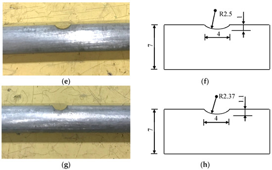 Wire specimens with different semi-ellipsoidal notches of different depths. (a) No. D-1 Steel wire specimen; (b) dimension of No. D-1 steel wire; (c) No. D-2 steel wire specimen; (d) dimension of No. D-2 steel wire; (e) No. D-3 steel wire specimen; (f) dimension of No. D-3 steel wire; (g) No. D-4 steel wire specimen; and (h) dimension of No. D-4 steel wire.