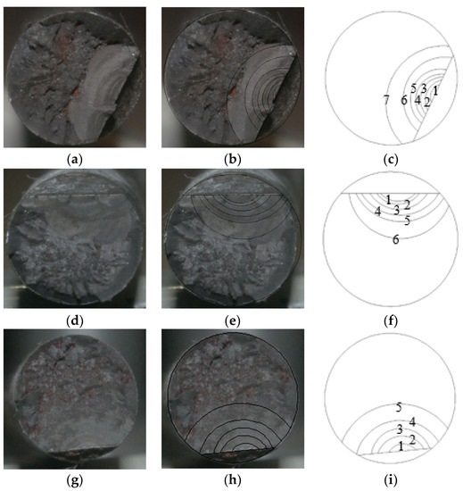Figure 25 shows the section morphologies of the three specimens without the hooking, the section morphologies with the hooking and the schematic diagrams of the hooking. It can be seen that with the increase of loading numbers, the three specimens all have different beach-like load shedding lines at the cross section.