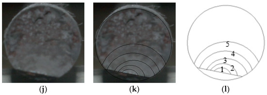 The “beach-like pattern” visible to the naked eye is created on the sample section by the method of load reduction, which is the so-called crack front marking technique. Through the reasonable design of the fatigue loading sequence, the stress magnitude and stress state of the crack front are changed, resulting in the change of the crack propagation rate, and then the plastic deformation marks are left at the fracture. In this way, the crack propagation morphology at the fatigue fracture can be clearly displayed, and the process of fatigue crack propagation can be tracked and reproduced. Plastic deformation marks are visible to the naked eye as “beach-like patterns”. Through image processing technology, the size of “beach-like pattern” can be measured. The depth and width of the “beach-like pattern” along the section of the specimen are the fatigue crack depth and width under these cyclic numbers.