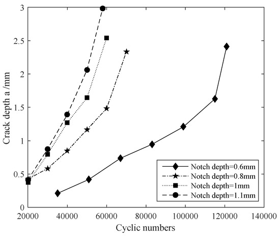 Figure 26 shows the variation of crack depth with cyclic numbers according to the data in Table 7. It can be seen that the rate of crack propagation presents a uniform trend. The sharper the shape of the notch, the faster the rate of crack propagation.