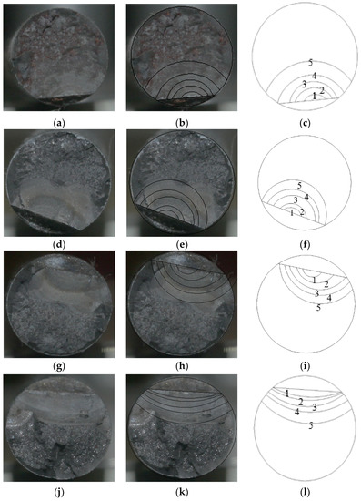 Figure 16 shows the section morphologies of the four specimens without the hooking, the section morphologies with the hooking and the schematic diagrams of the hooking. It can be seen that with the increase of loading numbers, the four specimens all have different beach-like load shedding lines at the cross section.