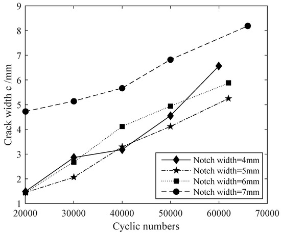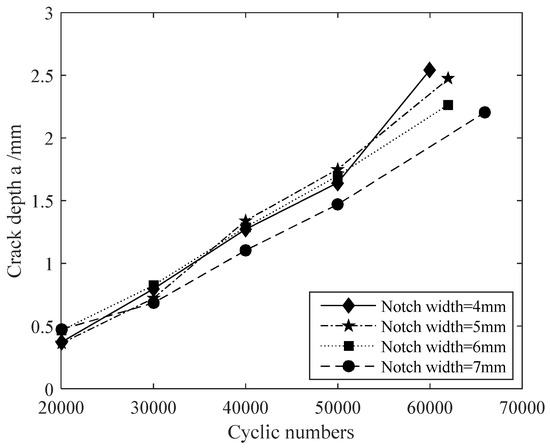 Figure 22 and Figure 23 show the change of crack depth and width with fatigue loading numbers obtained according to the data in Table 3. It can be seen that the rate of crack propagation presents a uniform trend. The smaller the initial width of the notch, the faster the rate of crack propagation.