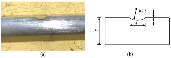 Steel wire for bridge cables in service is subjected to the fatigue loads and environmental corrosion. Corrosive medium is easy to form initial defects on the surface of steel wire. A large number of tests show that the initial defects on the surface of the old bridge cable wire caused by chlorine salt are mostly semi-ellipsoidal pits [22,23], which involves a complex electrochemical reaction process. In order to simplify the forming process of pits on steel wire surface, in this paper machine-cut notches are used to replace the pits caused by electrochemical inhomogeneity, and the effects of different notches size and morphology on fatigue crack propagation law were studied. A standard high-strength steel wire specimen with a diameter of 7 mm and a tensile strength of 1670 MPa specified in Chinese specification-GB/T 17,101 [24] was selected as the test specimen used in this paper, and the length of steel wire was taken to be 1100 mm. The steel grade of high-strength steel wire is S82B, and its chemical composition is shown in Table 1. Zn99.99 is the zinc used in the steel wire galvanized layer, and its chemical composition is shown in Table 2. The fabrication technology processing of steel wire includes pickling, phosphating, drawing, cleaning, hot-dip galvanizing, and stabilization, among which the stabilization process involves the heat treatment process. Domestic Stelmor air-cooled wire rod is used for bridge cables. The hot rolling temperature of austenitization is 950–850 °C, and the quenching temperature of the air-cooled wire used is 620–680 °C. As the heat capacity of air is low, and the thermal stability is weak, the transformation rate of pearlite is not stable during quenching. GB/T 17,101 is the specification of hot-dip galvanized steel wire for bridge cables in China, and all information about the chemical composition and fabrication technology processing of steel wire is contained in Section 7.1 of this specification. This specification is generally in line with the requirements of BS ISO 19203:2018, and a description of the steel grade and chemical composition can be obtained from Section 7 of BS ISO 19203:2018. The schematic diagram of defects on the surface of steel wire is shown in Figure 1, and the photo of the steel wire specimen is shown in Figure 2.