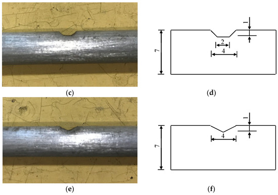 Wire specimens with machine-cut notches of different shapes. (a) No. S-1 steel wire specimen; (b) dimension of No. S-1 steel wire; (c) No. S-2 steel wire specimen; (d) dimension of No. S-2 steel wire; (e) No. S-3 steel wire specimen; and (f) dimension of No. S-3 steel wire.