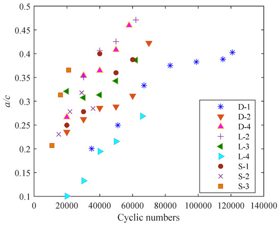 Figure 27 shows the scatter diagram of a/c varying with the cyclic loading numbers during the crack propagation of each group of steel wires. It can be seen that the ratio of a to c of each specimen is between 0.2 and 0.4, which indicates that in the case of uniaxial tension, the surface crack usually remains semi-elliptic during the propagation process. With the increase of cyclic numbers, the ratio of a to c gradually increases, which indicates that the crack propagation rate along the depth direction is higher than that along the width direction, but the shape of the crack front remains semi-elliptic during the crack propagation.