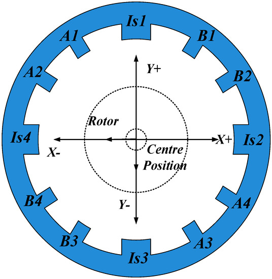 The BSRM has salient poles both in the rotor and stator, and the excitation is limited to stator windings only. The excitation currents are unidirectional and discontinuous. The stator phases are sequentially excited to obtain continuous rotation [12,13,14]. Hence, the design of the controllers for the BSRM is more complicated due to its nonlinear magnetic field distribution. The basic 12/14 BSRM salient pole structure is illustrated in Figure 1. Two regulated individual DC voltages are given to the suspension and torque coils to realise the decoupled performance between the net suspension winding’s force and main winding’s torque. The suspension winding coils Is1 and Is3 produce the radial force in the Y-directional, and coils Is2 and Is4 produce the radial force in the X-directional. Positive suspension forces are produced from Is2 and Is1; similarly, Is4 and Is3 poles produce negative suspension forces. The resultant rotational torque will be produced from the stator main phase coils called phase-A and phase-B. The operating parameters and ratings of the 12/14 BSRM are given in Table 1.