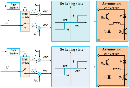 Due to many advantages, such as the capability of independent control for each phase and four switching modes, asymmetric converters are adopted for suspending force windings and torque windings, respectively. The topology of the asymmetric converter circuit is shown below in Figure A1.