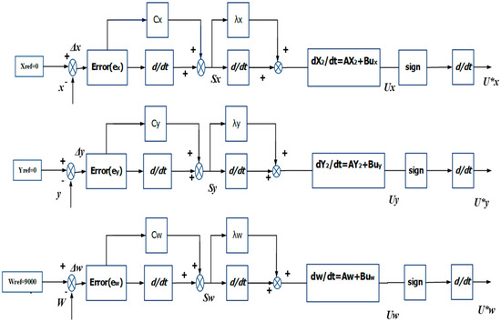 Defining the state tracking errors and the switching functions are , , and respectively, where and and it must be Hurwitz. The first-order derivative of the switching functions is given by: