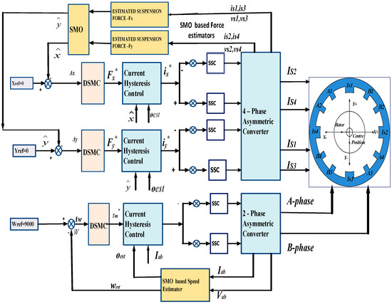 The detailed block diagram of the sensorless control BSRM is shown in Figure 6. The reference displacements are started at (0, 0), and the reference speed is fixed at 9000 rpm.
