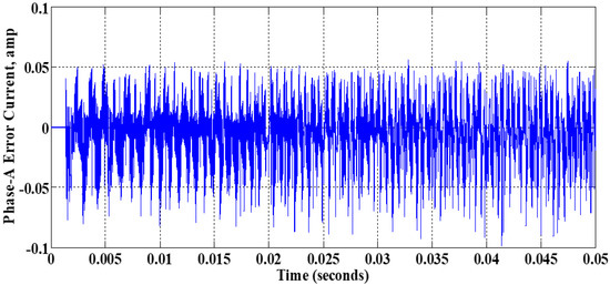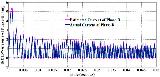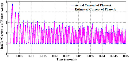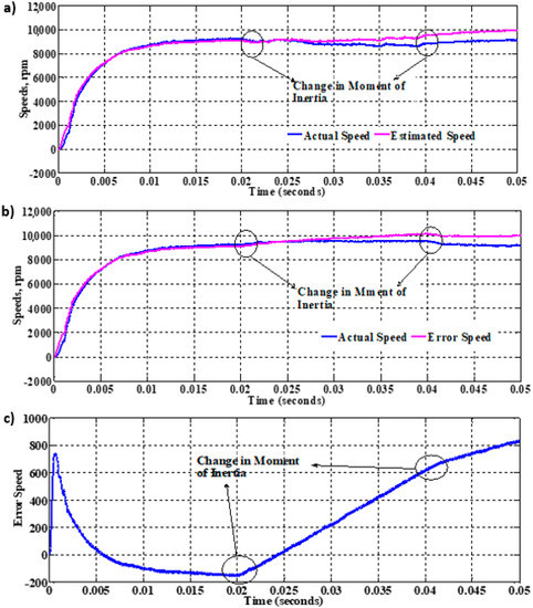 From Figure 18, the proposed observer maintains the stability and robustness in both the measured and actual speeds, even though there is an unexpected variation in the reference speeds: 9000 to 6000 rpm at 0.02 s and 6000 rpm to 9000 rpm at 0.04 s.