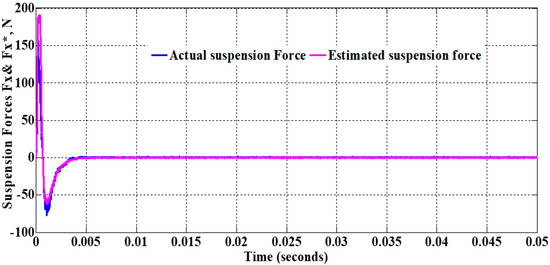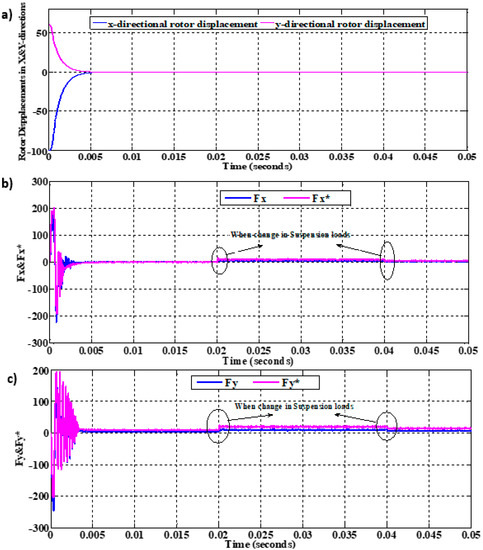 The fast-tracking and robustness properties of suspension parameters are verified and observed by increasing the suspension load of +10N at 0.02 s and removing it abruptly at 0.04 s. The actual and measured rotor displacement suspension forces are shown separately in Figure 16a–c, when the rotor is subjected to unexpected variations of the suspension loads. From Figure 16, it is clearly noticed that the proposed observer rapidly tracks the suspension forces, rotor displacements, in less than 0.003 s. The DSMC-based SMO suspended rotor parameters show the fast response in the transient period and stable robust behaviour at the steady-state conditions against the suspension loads.