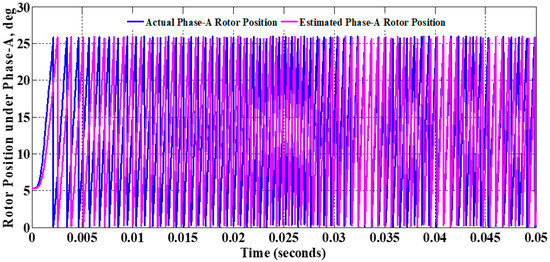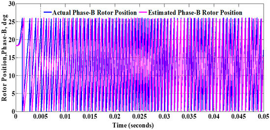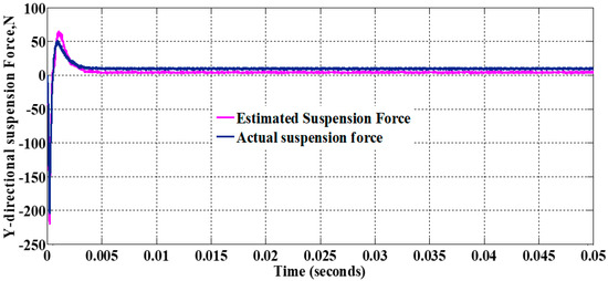 Figure 11, Figure 12, Figure 13 and Figure 14 show the actual and estimated suspension forces of both the X and Y directional windings, respectively. The actual and estimated suspension forces reached their steady states quickly, in less than 0.05 s only. Similarly, from Figure 13 and Figure 14, it can be observed that the observer tracks the rotor positions in less than 0.0001 s for both phases. In Figure 15, the estimated and actual net torques are presented. From Figure 15, it is observed that the actual torque consists of both positive and negative ripples, because there is no technique that is employed to decrease the torque ripples in the actual system, but the observer’s torque consists only of positive ripples and no more negative ripples due to the sensorless observer operation.