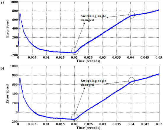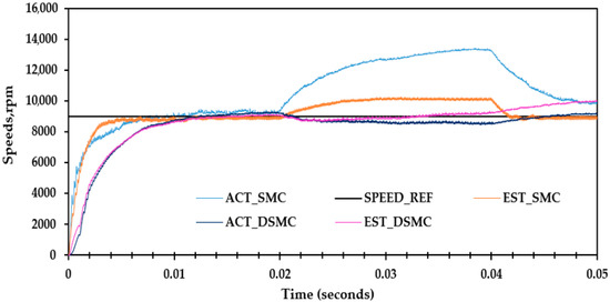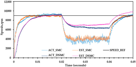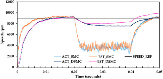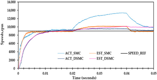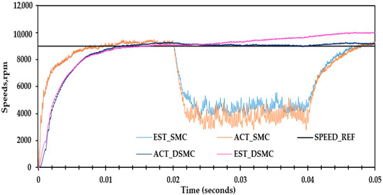 The observer rapidly tracks the speed in less than 0.001 s when the motor operated with a controlled current command of the proposed SMO at normal conditions. The actual and measured speeds of both the proposed controller-based SMOs are shown in Figure 17. From the figure, it can be observed that the speeds of the DSMC-based SMO reached their rated rpm in 0.01 s only. Hence, the DSMC-based SMO tracks the rated speed in less time due to the fast decaying exponential function in the switching surface.