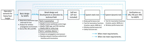 First, functional requirements, system requirements, and interface requirements of WDPS are derived based on the operational requirements of heavy haul freight (ex, target vehicle, length of train, operating speed, test section, etc.). The second step, the design and development for each technical field, is performed based on the requirements derived in the previous step. In the locomotive field, the S/W modification for the control logic of propulsion/braking and TCMS and the control circuit modification for the safety circuit configuration are performed. In the wireless field, a design to minimize interference factors through analysis of the propagation environment in the test section and a design for interface with the locomotive are performed. When development is completed for each technical field, a self-test is conducted, and if there is no problem, a system static test is performed with the heavy haul freight configuration by the operation requirements. At this step, in order to safely operate heavy haul freight, the braking performance, the main functions of the locomotive, and the safety functions that must be operated in an emergency must be confirmed. When all the essential functions and performance are satisfied in the static state, the next step is to check the function and system requirements of WDPS and the normal operation of heavy haul freight under the operating requirements. If the requirements of each stage are not satisfied, return to the system design stage to check the problems, draw up improvements and reflect them in WDPS.