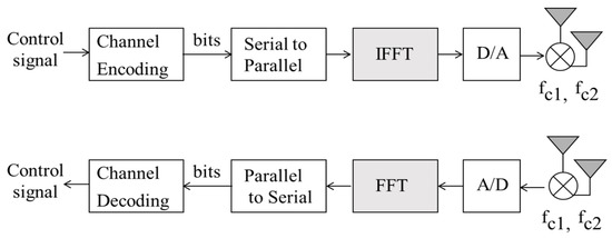 It was judged that the snake motion of the heavy haul freight in domestic freight line with many tunnels and curved sections would affect the signal attenuation. Therefore, in this test, MIMO-OFDM-based WDPS, which is strong in multipath fading environment and capable of high-speed data transmission, is applied and its performance is verified. OFDM processes data in parallel, as shown in Figure 2, divides a high-speed data stream at low speed, and transmits them simultaneously using a carrier frequency. Since the symbol interval is increased by using a low-speed parallel carrier, ISI is reduced, and by using multiple carriers, there is a strong advantage in frequency selective fading [20,21].
