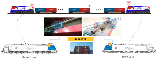 Many researchers have studied on heavy haul freight. Zhao et al. presented the minimum time delay of the distributed control signal between the control locomotive (master) and the controlled vehicle (slave) to minimize the longitudinal impact through dynamic simulation [6]. Gao et al. discussed brake performance when driving on steep slopes in locotrol-based distributed control [7]. Huang et al. proposed a method for synchronizing the four distributed wireless distributed modules to transport 50,000 tons in China, and verified this at the laboratory level [8]. Research on the operation of the heavy haul freight has been conducted since the 1970s and communication technology is still being applied, though technology has developed dramatically. WDPS technology in the 400 or 800 MHz band, which is currently used in many countries, has little radio wave loss and a wide communication range, but the transmission rate is limited to 19.2 kb/s [9]. Due to the development of mobile communication technology, large-capacity and high-speed wireless communication is being used for train control, operation, and maintenance [10,11,12]. In the case of freight, various sensors are requested to collect status information data using GHz band wireless communication and utilize it for maintenance [13,14]. For passenger trains, WiFi communication technology in the 2.4/5 GHz band is applied to communicate between onboard and wayside for communication-based train control [15,16,17].