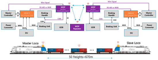 In recent years, as the importance of rail freight transport has emerged as a solution to problems such as energy shortage and climate change, various technical attempts have been made to efficiently operate freight trains [1]. Australia, Canada, the United States, and China, which have a high distribution ratio of freight, are already operating heavy haul freight using wired/wireless distributed control technology as a way to further improve their freight capacity. The heavy haul freight has a shorter braking time, and thus a shorter braking distance, than the conventional centralized control [2]. When the position of the locomotive is not appropriate, the impact between freights due to the asynchronous control time may cause damage to the coupler or a derailment. The ECP braking system which is wired distributed control installed in all freights is connected to the train line to synchronize control signals, and is applied to the transportation of dangerous substances such as gas and oil that require precise control to secure operational stability. But the wired distributed control method has the disadvantage of installing and maintaining a trainline [3,4]. Another method, the existing wireless distributed control method, applies the FSK method in the 400 and 800 MHz band. The FSK method has a wide communication range and is resistant to diffraction, relatively simple device implementation, but has low frequency efficiency, so it is possible to transmit only the minimum information necessary for operation [5].