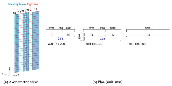 High-rise ordinary shear wall structures were idealized using two-dimensional plane models. A total of three models denoted by Model A, Model B, and Model C are constructed, designed and evaluated. Figure 1a,b show the three-dimensional view and plan of the Model A. The model is composed of five walls, of which R1 and R2 are coupled shear walls with a rectangular cross section, R3 is a single wall with a rectangular cross section, and T1 and T2 are coupled shear walls with a T-shaped cross section as illustrated in Figure 1a,b. CB1 and CB2 represent coupling beams. Those five walls are connected with rigid links (red line), which constrain only the translational degree of freedom in the X-direction. The length of coupling beams CB1 and CB2 in Figure 1b is 1 m and 1.5 m, respectively, reflecting the width of doors and windows. The depth of those coupling beams is set to 0.6 m and 1.2 m, respectively. The width of the coupling beam is the same as the thickness of the adjacent walls. The dimensions of coupling beams are common among the three analytical models. Table 1 represents the characteristics of the three models.