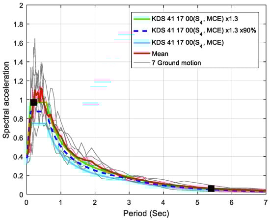 Target response spectra and average response spectra by seven pairs of ground motion scaling (Site class: , maximum considered earthquake (MCE), Model B).