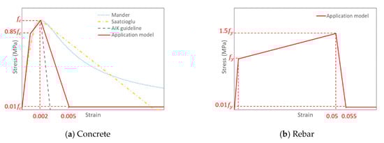 For nonlinear dynamic analysis, shear walls were modeled using fiber elements. Uniaxial inelastic models for concrete and rebar are represented in Figure 4, respectively. The unconfined concrete model proposed by Mander and Priestley was used to represent the nonlinear behavior of the concrete before the maximum compressive stress of concrete [16]. In accordance with the AIK guidelines, the stress drops to the residual stress after reaching the maximum stress at the strain of 0.002. The ultimate strain at the end of stress drop is prescribed as 0.003 in the guidelines. However, the ultimate strain of 0.003 may underestimate the deformation capacity of actual unconfined concrete. Figure 4a represents the nonlinear behavior beyond the maximum compressive stress for concrete models by Saatcioglu, and Mander and Priestley, in which deformation capacities considerably higher than 0.003 are observed [16,17]. Therefore, it is necessary to set an appropriate concrete deformation capacity beyond the maximum compressive stress of concrete.