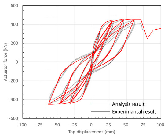 In this study, the ultimate strain was determined by comparison of the test and numerical analysis results for an existing specimen tested by Dazio et al. [18]. A total of 1% of the maximum stress is applied to the residual stress of the unconfined concrete model. Using 0.005 for the ultimate strain, it was confirmed that the experimental results and the analytical results were in good agreement for each cycle, and the deformation at the strength drop was simulated well in Figure 5. Therefore, unconfined concrete model with the ultimate strain of 0.005 and residual strength ratio of 0.01 times the maximum stress is adopted for the analytical models in this study. The inelastic material model for reinforcing bars was determined referring to the works of Thomsen and Wallace, Orakcal and Wallace, and Tuna [19,20,21]. The tensile strength of the rebar was selected to be 1.5 times the yield strength, and the tensile strain at the tensile strength is 0.05. The nonlinear model of reinforcing bars was created symmetrically, but the limit of compressive strain was set to be 0.02 considering buckling as shown in Figure 4b.