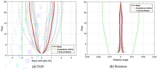 Four engineering demand parameters (EDPs) such as inter-story drift ratios, plastic hinge rotation angles, shear forces and compressive extreme-fiber strains were checked with the acceptance criteria for the performance level. TBI v2.03 limits the mean peak inter-story drift ratio for the whole ground motion suites below 3.0% and individual peak inter-story drift ratio for each ground motion suite below 4.5% in order to prevent collapse [26]. However, the upper limit of mean peak inter-story drift ratio is specified as 2.0% for the prevention of collapse in the AIK guidelines, because most shear walls are designed in the type of ordinary shear walls without confinement at boundary regions and 3.0% inter-story drift ratio could overestimate the performance of those shear walls. Therefore, ordinary shear walls in this study were also designed using the 2.0% inter-story drift ratio limit in accordance with the AIK guidelines.