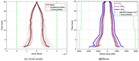 The plots for 0, 1.2 and 1.5 are shown in Figure 6d. The maximum demand-to-capacity ratios for individual wall elements along the height are summarized in Table 7. The design of shear strength was performed for 1.0, 1.2, and 1.5 times the mean shear force demand in order to investigate the seismic fragility performance with respect to the design shear force level. In Table 7, there are shear walls designed with a DCR much lower than 1.0, which is the result of amplified shear force demands which do not reach the shear strength for the minimum reinforcement ratio defined in the KBC 2016 [1].