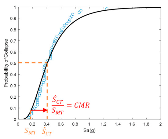 The FEMA P695 criteria for collapse prevention require that the CMR be above a specified allowable value and the collapse probability at the MCE level of spectral acceleration be less than 10%. An example of the seismic fragility curve in the form of a cumulative lognormal distribution function is shown in Figure 7, to illustrate those two collapse prevention criteria. In Figure 7, the CMR is defined as , where is the spectral acceleration corresponding to the fundamental mode period of the analytical model at the MCE level spectrum, and is the spectral acceleration with 50% collapse probability in the fragility curve. The collapse probability is evaluated at .