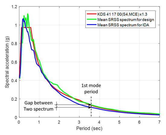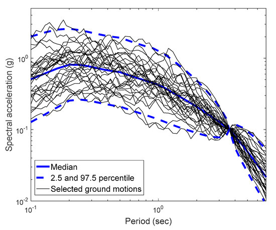 The spectral shape of ground motion records is an important factor that influences the result of IDA and the corresponding collapse fragility. Baker and Cornell found that the spectral shape for the MCE level ground motion of the western area of United States and the shape design spectrum shape of ASCE 7-05 are different significantly over a certain period of time [29,30,31]. In addition, the structural analysis for those spectra having such differences showed that there is a considerable difference in collapse prevention performance. Baker and Cornell proposed a conditional spectrum to compensate for that kind of difference. The conditional spectrum has a spectral acceleration corresponding to a specific return period at a control frequency, and spectral accelerations at other periods are determined by a percentile conditional on the spectral acceleration at the control frequency. The conditional spectrum thus provides statistical information about the variability of the spectrum at periods other than the control frequency. In this study, ground motion suites for the IDA were selected and scaled using the conditional spectrum.