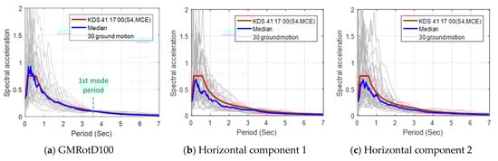 It was assumed that the target spectrum was defined in the direction of the maximum spectral acceleration and GMRotD100 spectrum of each ground motion suite is used in amplitude scaling of each suite. The GMRotD100 spectrum is the 100-percentile of the geometric mean dependent on period [35,36]. Figure 9a shows the GMRotD100 spectra of individual ground motion pairs and the target MCE spectrum for the Model B. Figure 9b,c compare the target spectrum and the individual ground motion spectra for each horizontal component, respectively, for the Model B. The median spectrum and the target MCE spectrum for each direction have considerable difference in the spectral acceleration ordinate, but the difference is only slight at the control period.