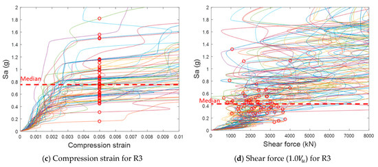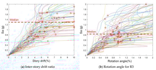 The second EDP is the plastic hinge rotation angle of the wall element. The exceedance of acceptance criteria by at least one shear wall element was deemed collapse. The acceptance criteria for collapse prevention defined in ASCE 41-17 was adopted. The allowable plastic rotation angle is dependent on the extent of confinement at the boundary of the wall section and was determined for each analysis case, considering the axial force ratio and shear force demand determined from the dynamic response analysis results. IDA curves with respect to the plastic hinge rotation angle are plotted in Figure 11b for the component wall R3 in Model A. The circles represent a point where the EDP reaches the acceptance criteria. Plastic hinge rotation angles at the circles are different because they are dependent on the shear force demand for the wall.