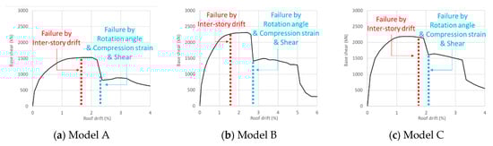 Thirdly, concrete compression failure at the boundary of the wall section can cause instability of the structure. The instability of the wall structure due to concrete compressive failure is assumed to occur when the compressive strain of concrete reaches a value where the stress drops to zero, passing through the peak stress at 25% of the wall length from the compressive extreme of the wall section as shown in Figure 12, according to the study of Gogus and Wallace and the NIST 10-917-8 report [6,7,38]. This is based on experiences showing that the instability of wall structures occurs in pushover analysis when concrete stress at such a place drops to zero. In this study, pushover analysis for the three analytical models was conducted to examine the adequacy of the acceptance criteria for the compressive strain at the specified location. The concrete model used in this study reaches residual strength (1% of the maximum strength) at the strain of 0.005, as mentioned in the preceding section. The results of the pushover analysis are shown in Figure 13, in which the roof drifts where the compressive strain reaches 0.005 at the point of 25% wall length, away from the compressive extreme of the section are also represented. As a result of the analysis, it is observed that a sharp drop of strength and the concrete compression failure at the specified location occur simultaneously. Therefore, the concrete compression failure criteria can predict collapse appropriately and included in collapse probability calculation. IDA curves with respect to the compression strain are plotted in Figure 11c for the component wall R3 in Model A. The circles represent a point where the compression strain reaches the acceptance criteria for the compression strain.
