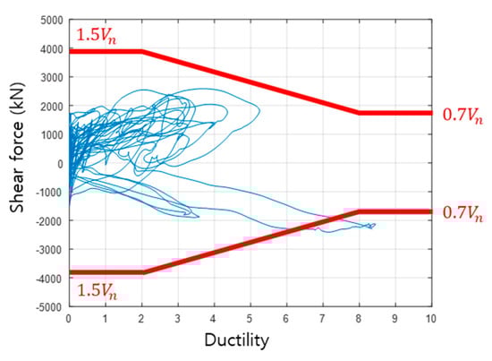 In literature, decrease in shear strength with respect to flexural ductility was considered in the seismic evaluation based on existing experimental data [20,39,40]. This reduction of shear strength is caused by increasing damage due to flexural deformation. In this study, the envelope of the shear strength with respect to the flexural ductility suggested in the study by Gogus was adopted to examine whether the failure of shear components that are modeled elastically occurs or not after each nonlinear dynamic analysis. An example of shear failure envelope and the history of shear force with respect to flexural ductility is illustrated in Figure 14. In the illustrated model, 1.5 times the nominal strength is permitted when the flexural ductility is 2 or less, but only 0.7 times the nominal strength is permitted when the flexural ductility reaches 8 or more. When the flexural ductility value is between 2 and 8, linear interpolation is used. IDA curves with respect to the shear force are plotted in Figure 11d for the component wall R3 in Model A. The circles represent a point where the shear force reaches the acceptance criteria. Shear forces at those circles are different because they are dependent on the flexural ductility of the wall.