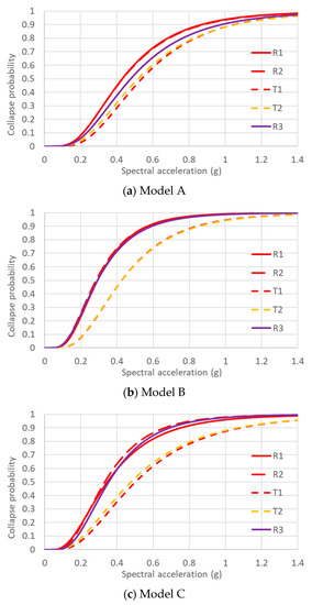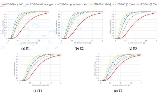 For individual component walls of Model A, the plastic hinge rotation angle has the highest collapse probability in most walls, but the highest collapse probability (11.2%) observed in the longest wall (R3) corresponds to the shear failure for amplification factor 1.0. As a result, the primary EDP changes from shear failure to plastic hinge rotation angle failure as the amplification factor to shear increases from 1.0 to 1.2 and 1.5, which reduces the potential of shear failure in the walls. Model B has a tendency similar to Model A, but shear failure is the primary failure mode of T1 and T2 as well as R3, and the transition from shear failure to plastic hinge rotation angle failure occurs at the amplification factor 1.2. In the case of the Model C, unlike the other two models, the wall with the highest collapse probability was R1, of which the failure mode is the compressive axial strain failure without change, in spite of the increasing amplification factor to shear force. This is due to the high axial force ratio of R1 caused by the small cross-section area and the characteristics of high-rise buildings. On the whole, the amplification factor to shear force 1.2 is enough to prevent shear failure from being the primary failure mode of the analytical model.