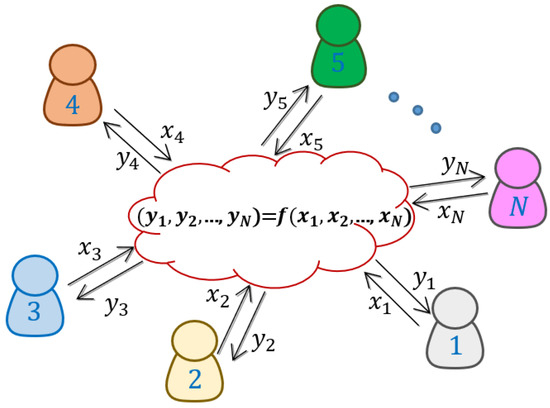 Consider a set of N agents and a multivariate function. For , a SMC service (see Figure 1) receives the input from the i-th agent and outputs back the value in such a way that no additional information is revealed about the remaining , for . Additionally, this definition can be strengthened by requiring that for some number of corrupt agents working together, no information about the remaining agents gets revealed (secrecy). It can also be imposed that if at most agents do not compute the function correctly, the protocol identifies it and aborts (authenticity).