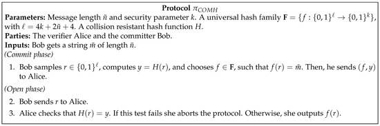 To study the time complexity of the protocol, consider first the complexity of . It requires two calls of H and one call of the universal hash family F, bit comparisons (if using the technique proposed in [29] to find the required f), and one additional evaluation of f. Cryptographic hash functions are designed so that their time complexity is linear on the size of the input, which in this case is . To compute the universal hashing, the construction in [29] requires binary multiplications. Thus, the running time of is linear on the security parameter k. On the other hand, has two security parameters: n, associated to the size of the keys used to encrypt the transferred bits, and m, associated to the security of the measurement test done by Alice. The protocol requires qubit preparations and measurements, calls of the commitment scheme, and n bit comparisons. This leads to an overall time complexity of for the protocol, which is linear in all of its security parameters.